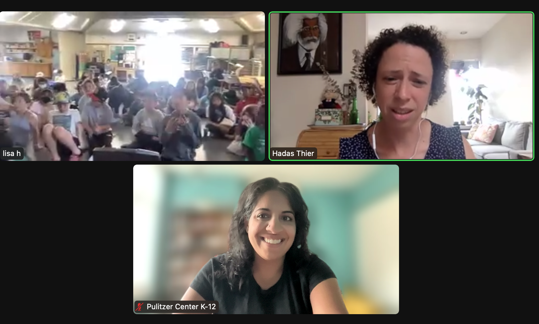 We strive for virtual visits to feel conversational and we encourage students to participate with questions and comments. A Pulitzer Center staff member also joins these visits to facilitate and share an introduction to media literacy and underreported stories.="" a="">