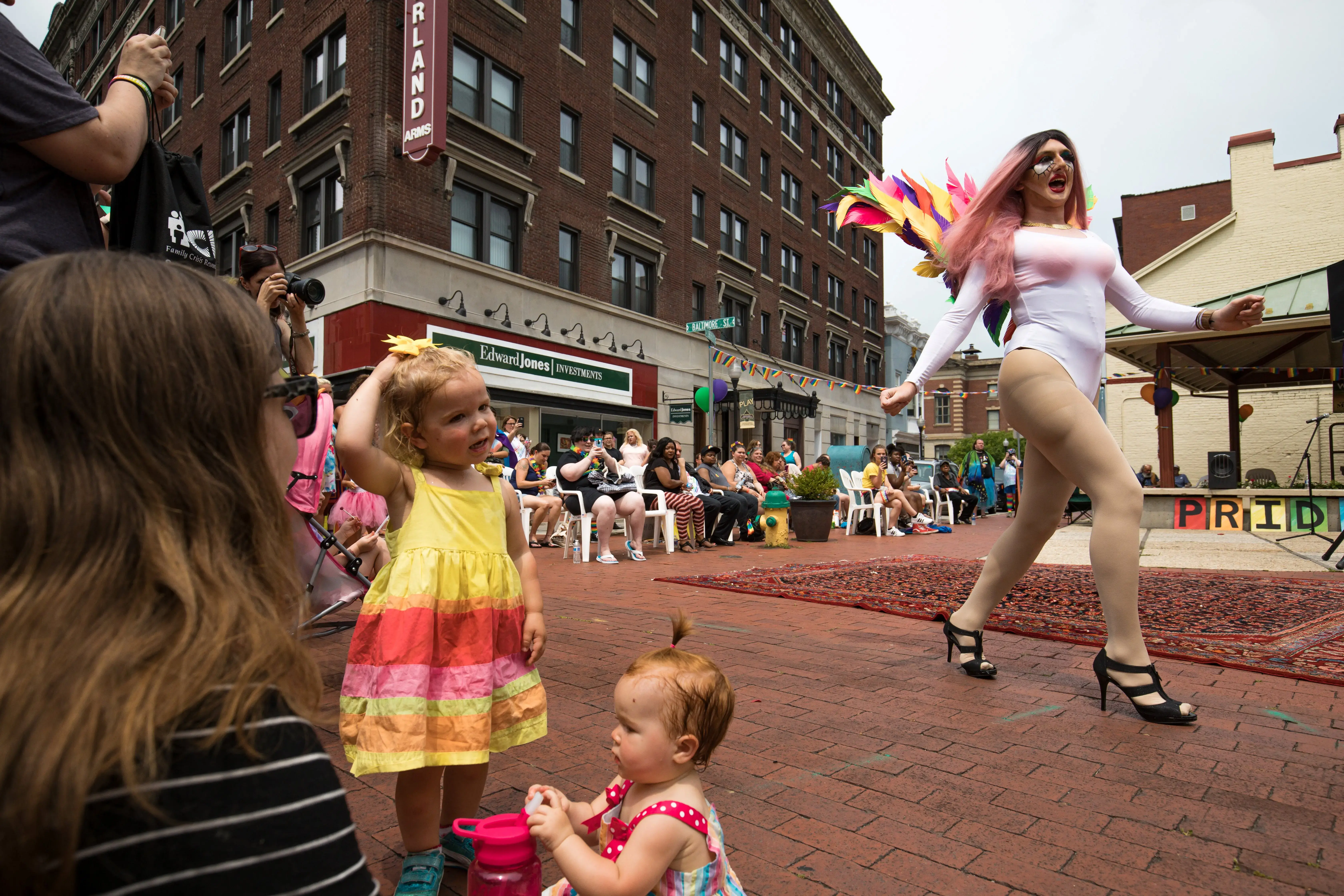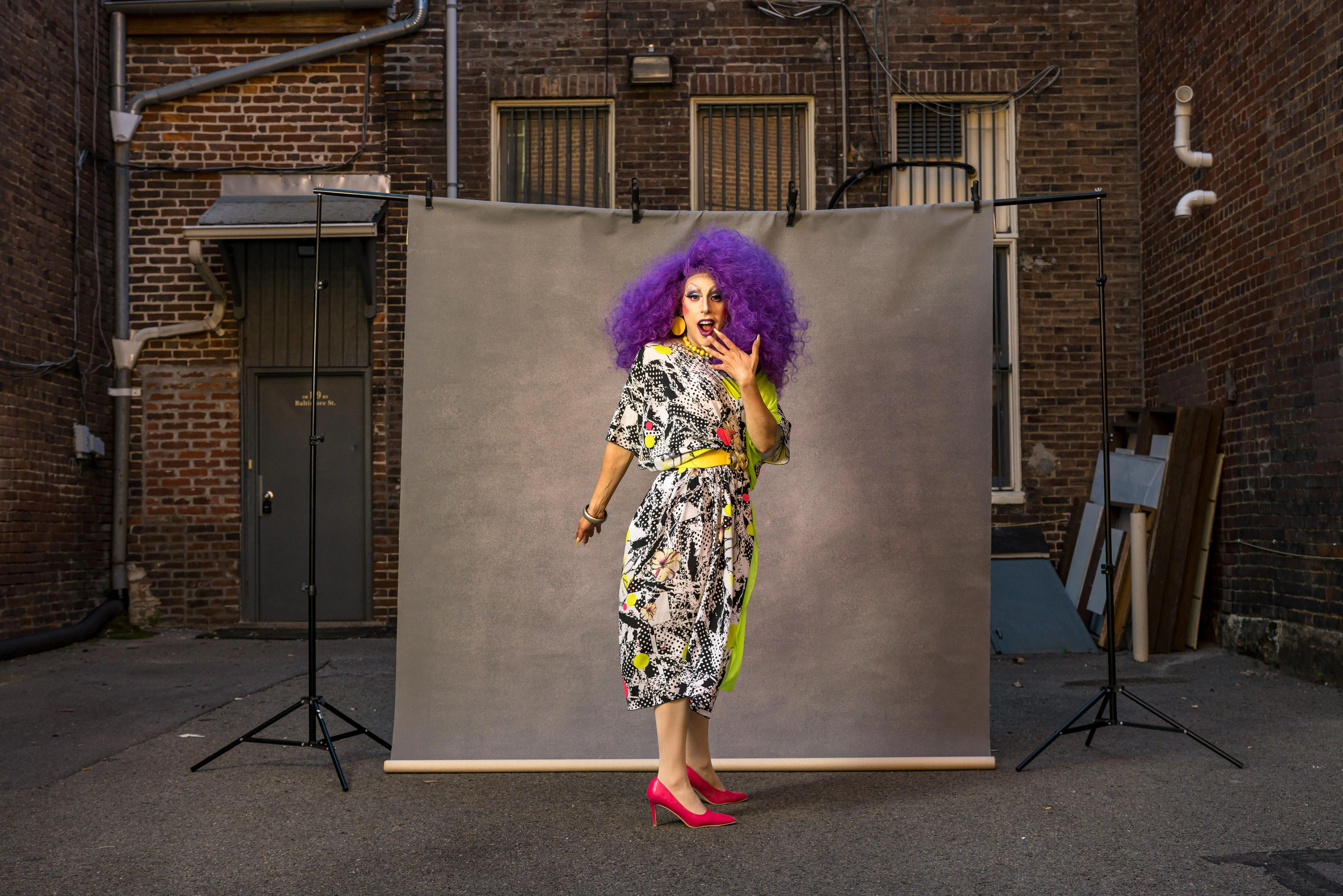 The afterparty at a brewery near downtown is like a bawdy family reunion. Mike Snyder sets up a backdrop in a brick alley a few blocks away for portraits with the queens in their Pride finest, and I volunteer to wrangle them over for this last photo shoot of the week. Trying to get drag queens who’ve spent a long day performing in the heat to leave a bar where the drinks are flowing is no easy task. “I’m herding queens,” I tell Mona, who’s waiting patiently to walk over with me. “Good luck with that,” she laughs.
