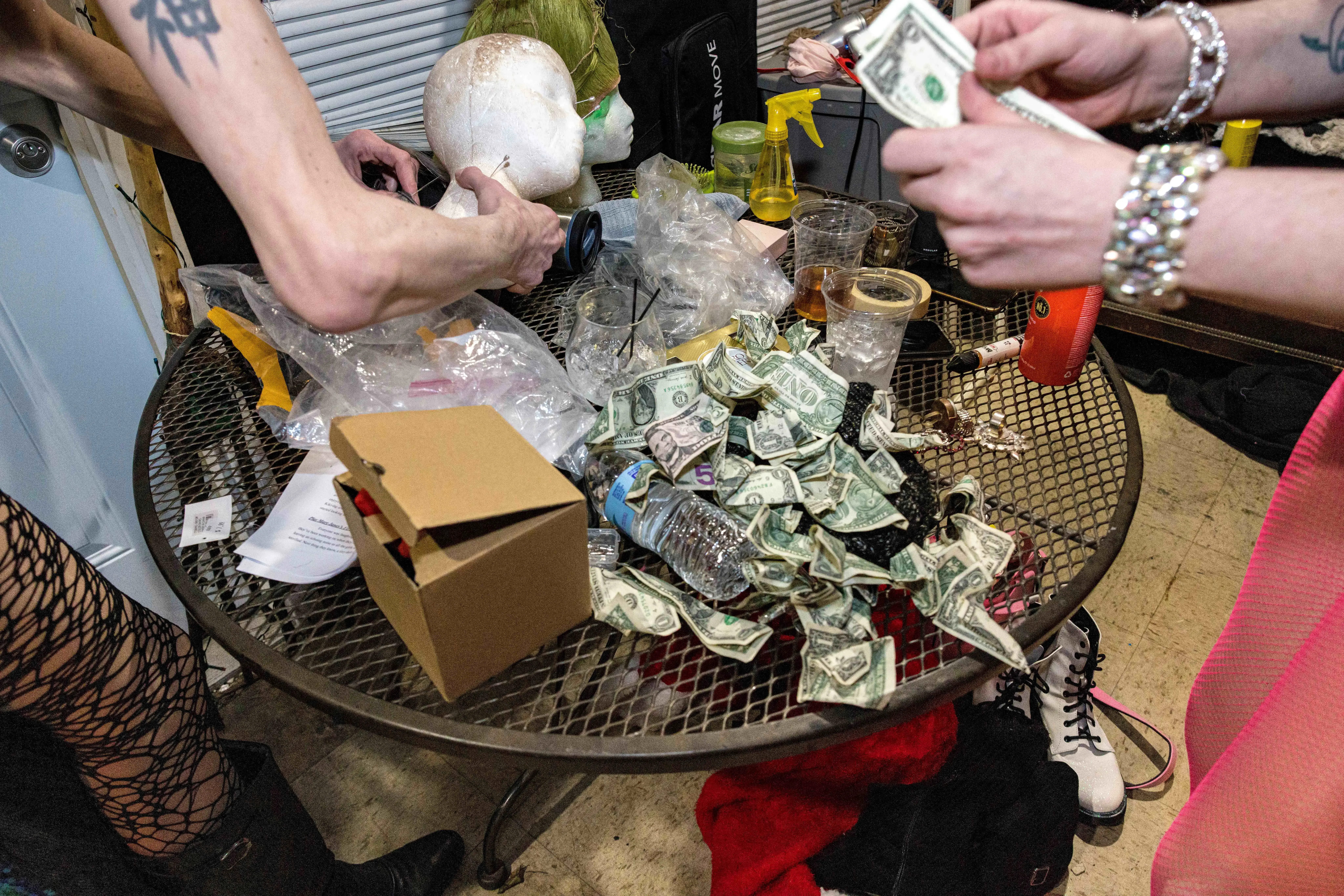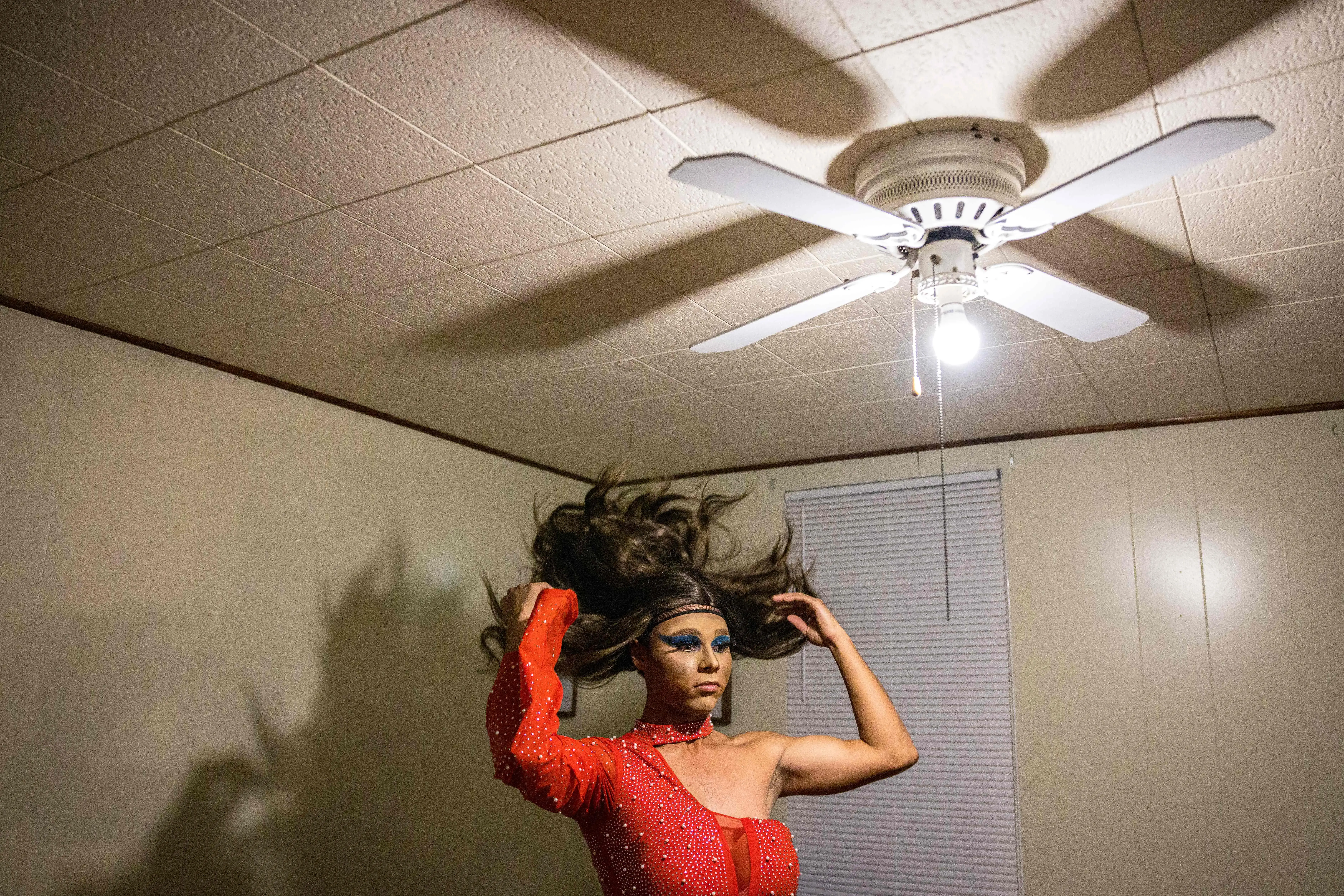 The bar doesn’t have a room big enough for the queens to change outfits, so they improvise in the parking lot. Between sets, Aradia and Mary Jane hunker behind a car with its doors splayed open so they can peel their dresses off and pull new ones on; sequins and heels and cases of makeup are scattered across the back seat. People pull in off the highway, gawking at the half-naked queens. The glittering chaos of outfit changes, a frantic shedding and adornment that usually unfolds out of sight, is on full display here, and the queens have no choice but to ignore the cars and stares, trying not to break a nail or an ankle as they slip into bedazzled heels and thigh-high boots on the uneven gravel.