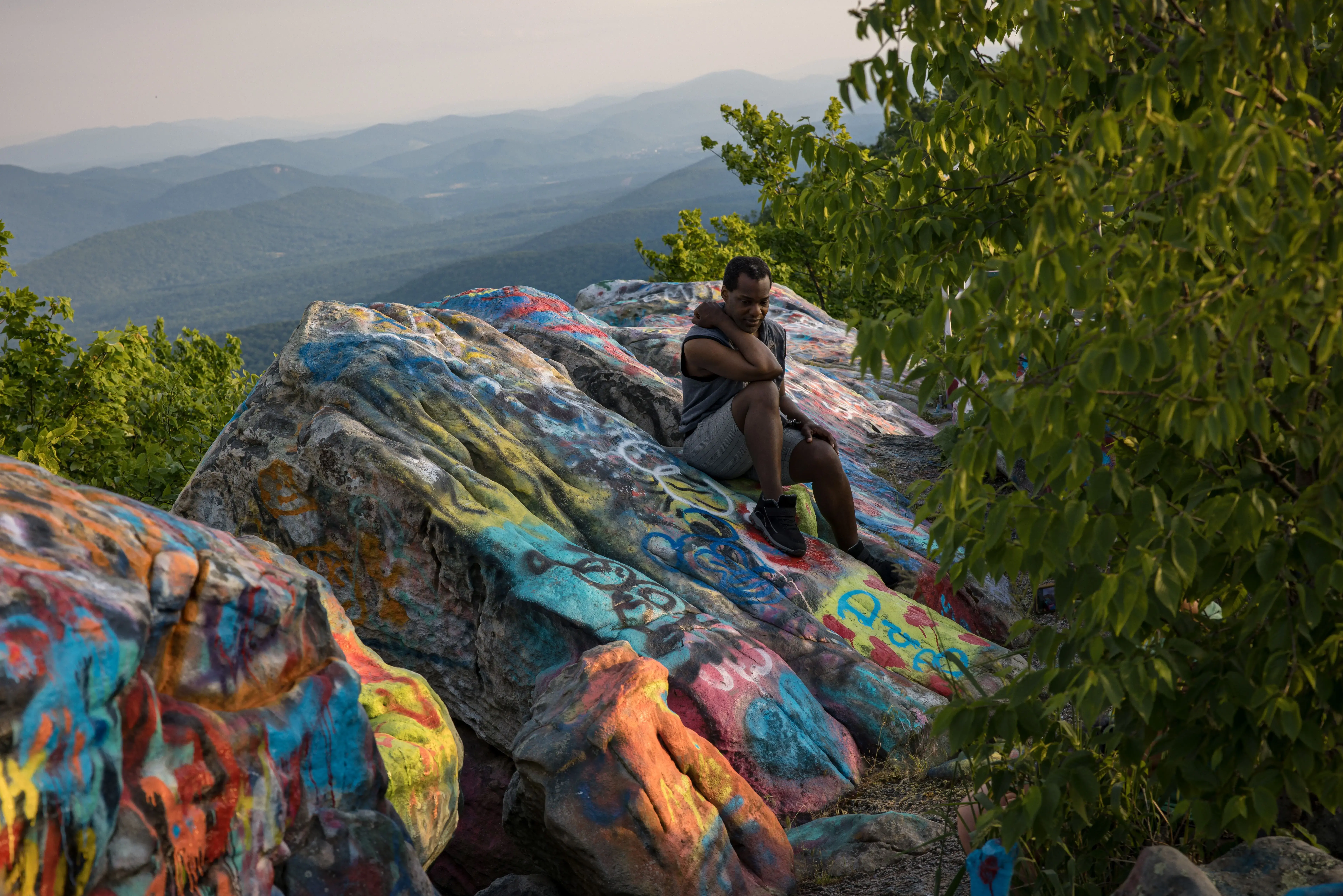 Mary Jane and Ty Walker, who performs as Claire Raven Bishop, are partners. Both are in their thirties, and both grew up in Baltimore before moving to Cumberland together in 2018. They describe challenging childhoods in Baltimore. Mary Jane, who’s white, grew up homeless at times, with parents in and out of prison; she herself was in and out of juvenile detention from the eighth grade on, before ultimately getting her GED. Ty is Black, and describes a childhood full of trauma: an abusive home life, an older brother shot to death, a deep rage at the world after the police murder of Freddie Gray. Ty tells me what he enjoys about living in Cumberland. “I like the fact that when I come outside, I can see mountains, and I can see clouds over the mountains, and the sun peeking over the mountains. It wasn’t like that in the city. All you saw was tall buildings and broken neighborhoods. That’s it. But the thing I hate about Cumberland—I hate the fact that when I go in stores, I’m always getting dirty looks. If I could change the racist looks, I would, but that’s something I can’t change.”