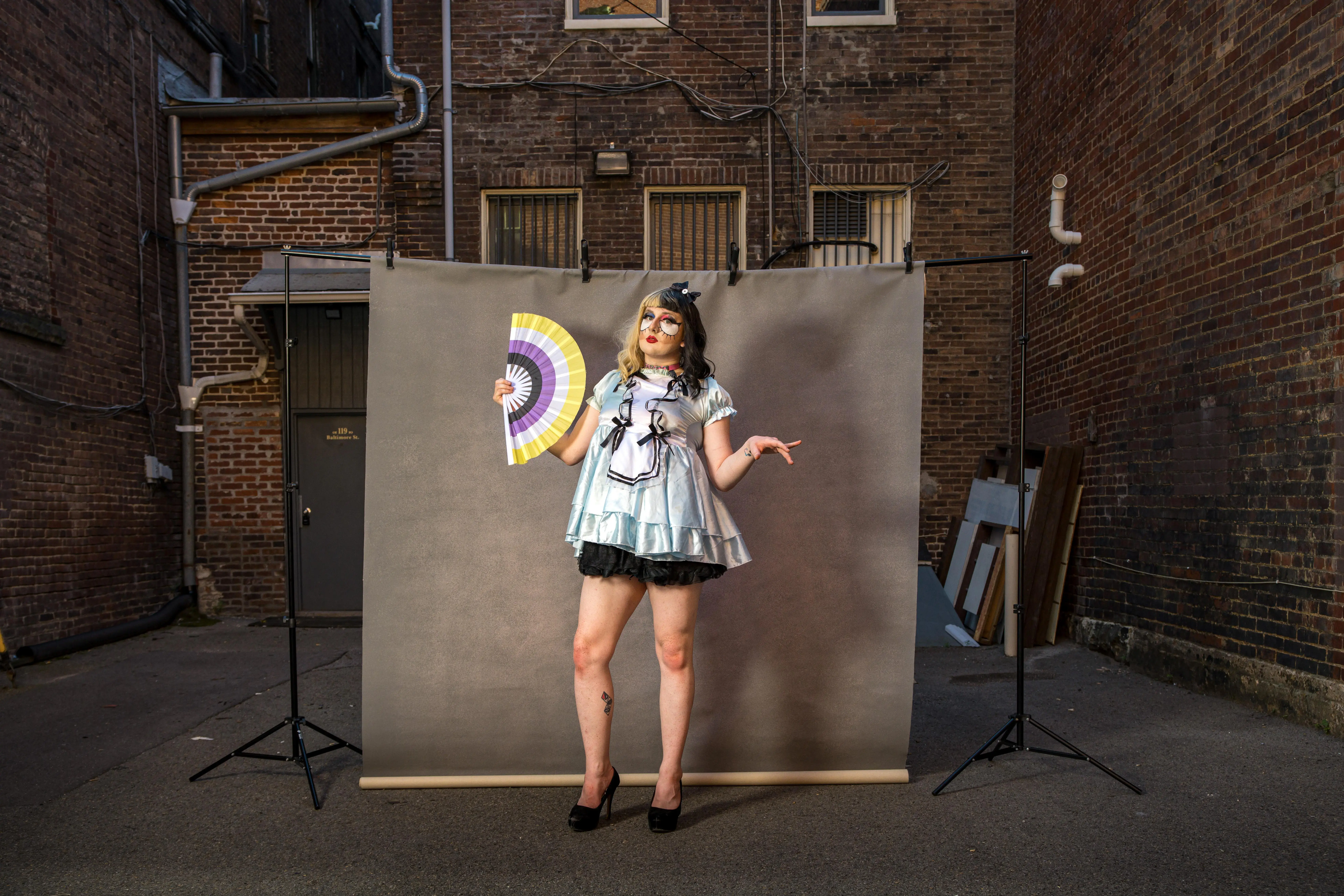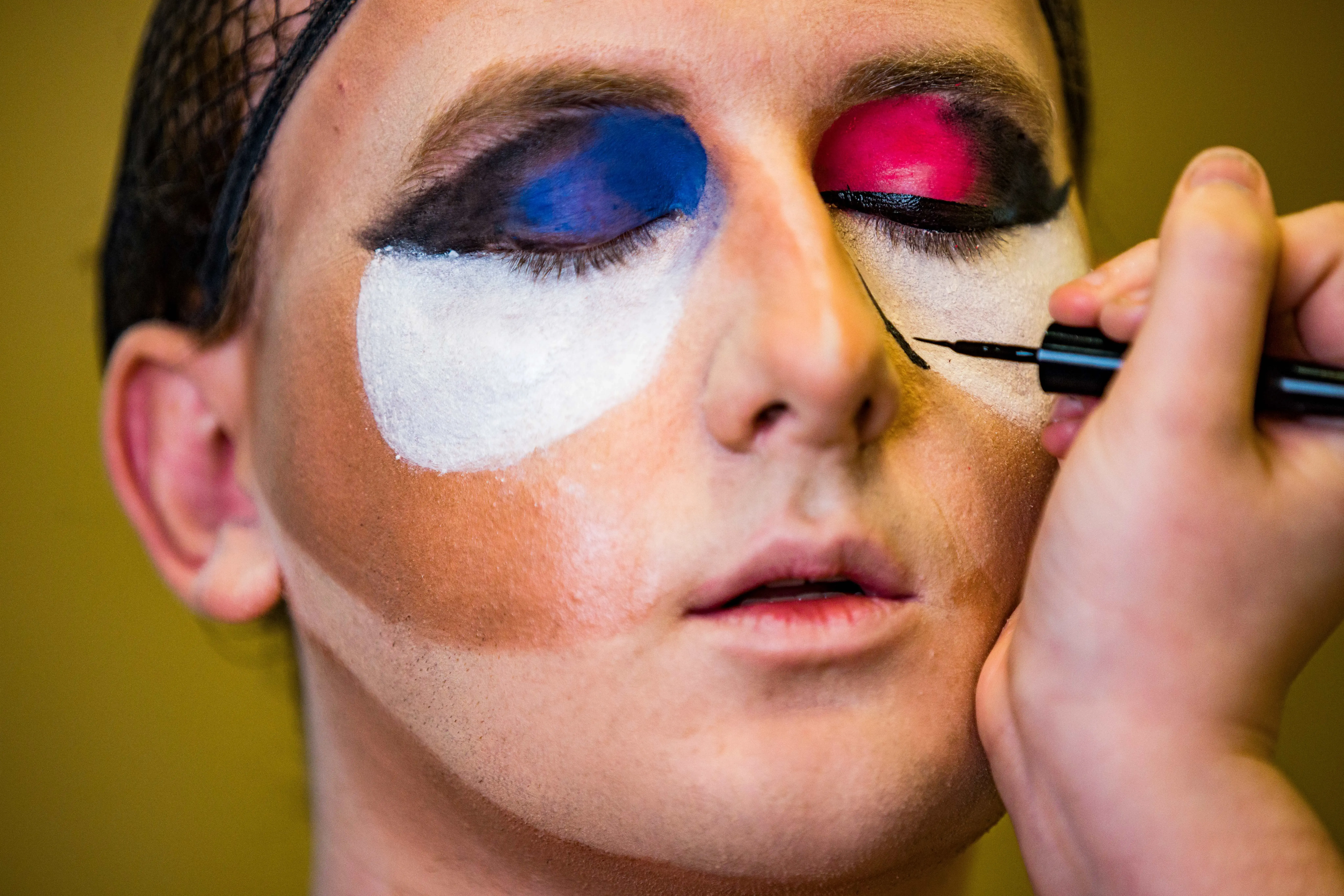 Tonight, Kijana is bringing the rich legacy of ballroom to this small mountain town. All of Cumberland’s younger queens are here. The audience sits on low benches and beanbags along the gallery’s walls, while multicolored lights spin overhead and loud gay anthems blast through the speakers. Outside the gallery, in the hallway beneath fluorescent lights, the queens chat with nervous energy. French Silk is the crew’s only bearded queen, her facial hair framing an elaborately painted face. Over by the entrance to the building, Envy Divine chats with friends. Her cheeks are painted with big white half-moons and exaggerated eyelashes. She’s dressed like a doll. When I snap a picture, she holds her hands as if her fingers are melded together, made of plastic. Violet LaFay and Andy Darling are here, and so is Maxine Young, who until tonight has been the group’s only Black drag queen. In daily life, Maxine’s face has a sweet and feminine aspect to it; tonight, in full makeup and wig, she projects a reserved but striking elegance. I run into Claire Raven Bishop, who confesses that she’s never done a drag performance until tonight. Outside of drag, she’s both extremely shy and quite butch, and when I ask how she’s feeling now, just minutes before going on, her answer has the gruffness of a coach being interviewed at halftime.
