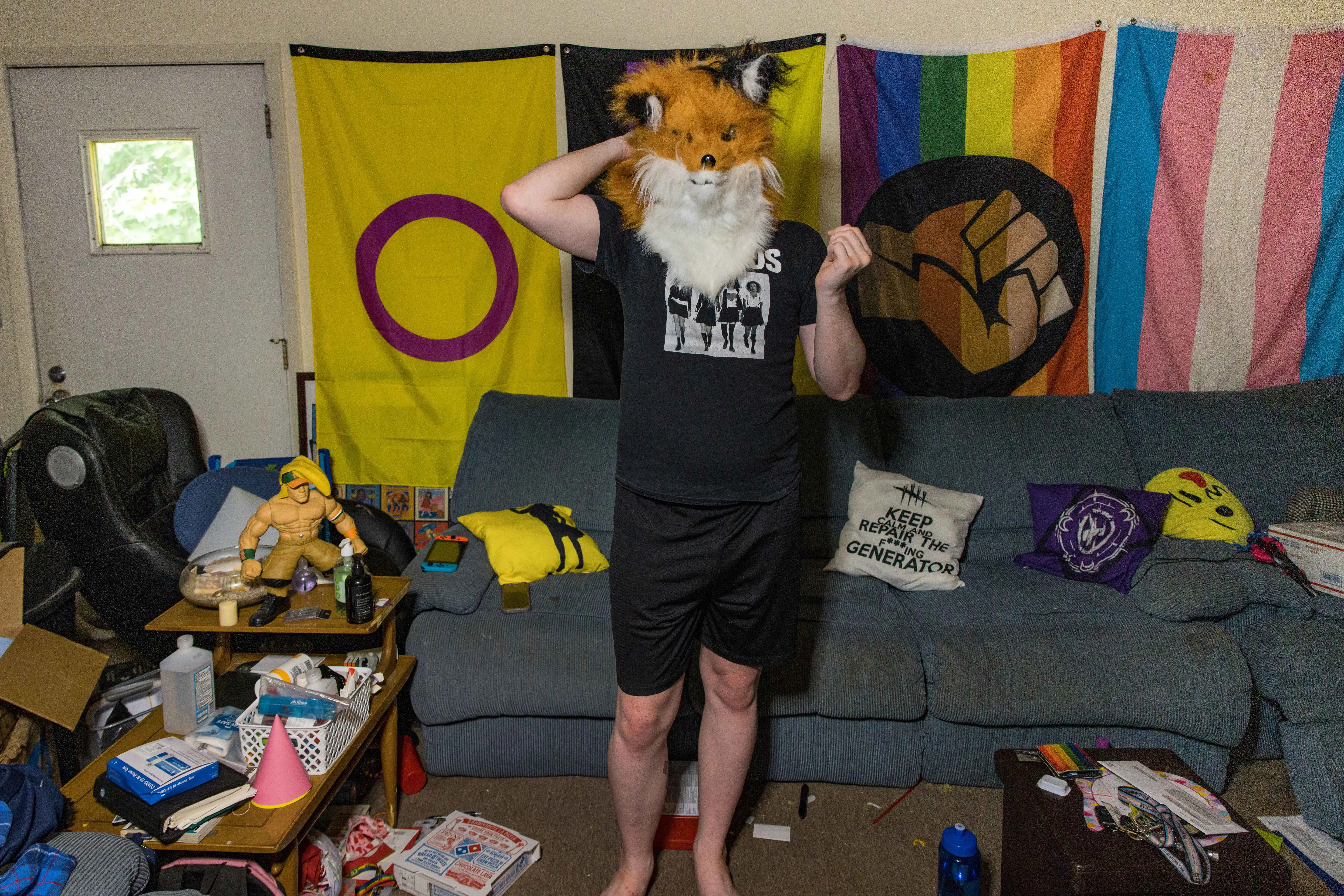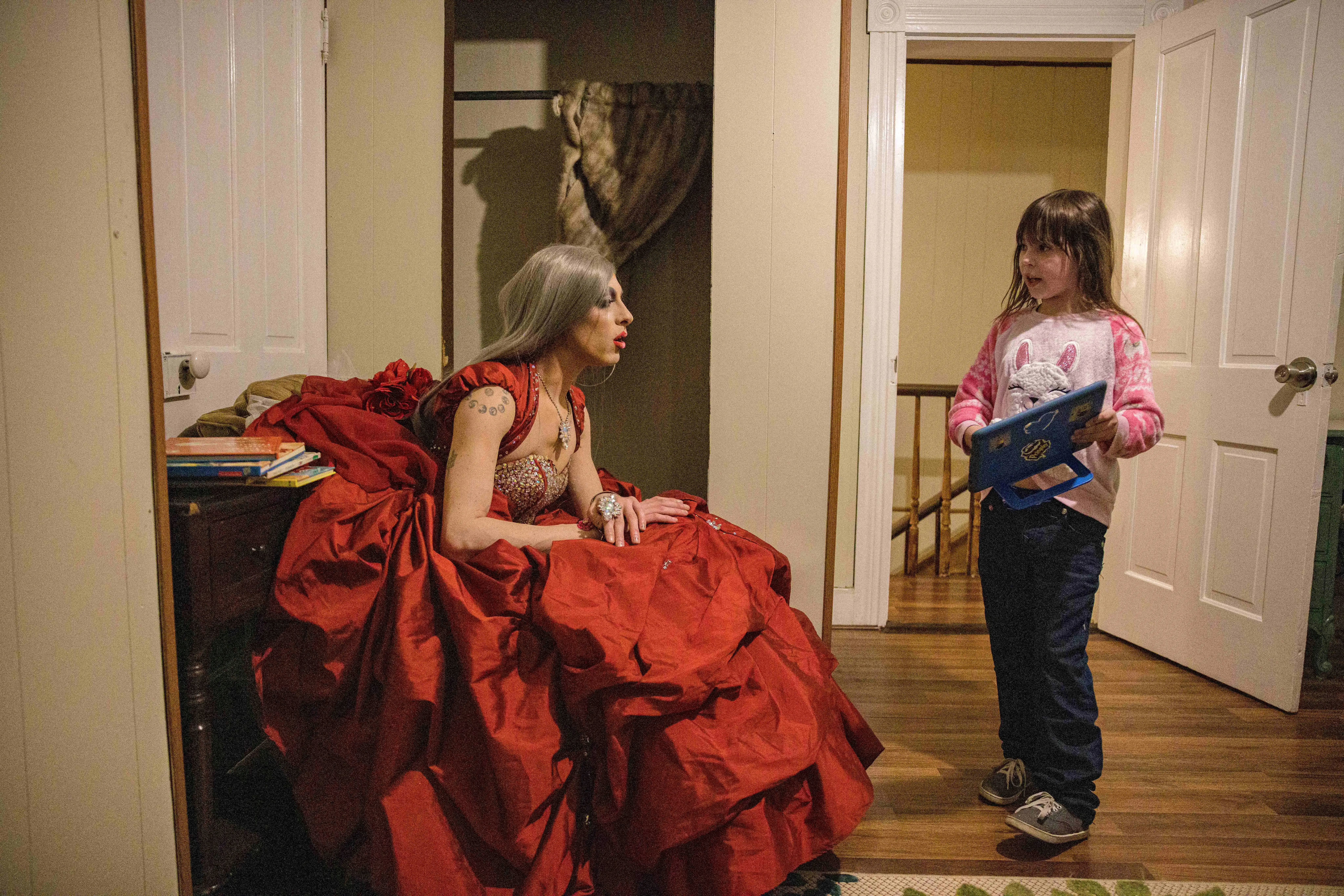 Mary Jane, her face covered in glitter, wears a commanding red ball gown. Ty, who performs as Claire Raven Bishop and is Mary Jane’s partner, isn’t performing tonight, and so has come instead in his suit, to take pictures. A few days later in their kitchen, I ask the couple if the increased intensity of these protests have them freaked out.