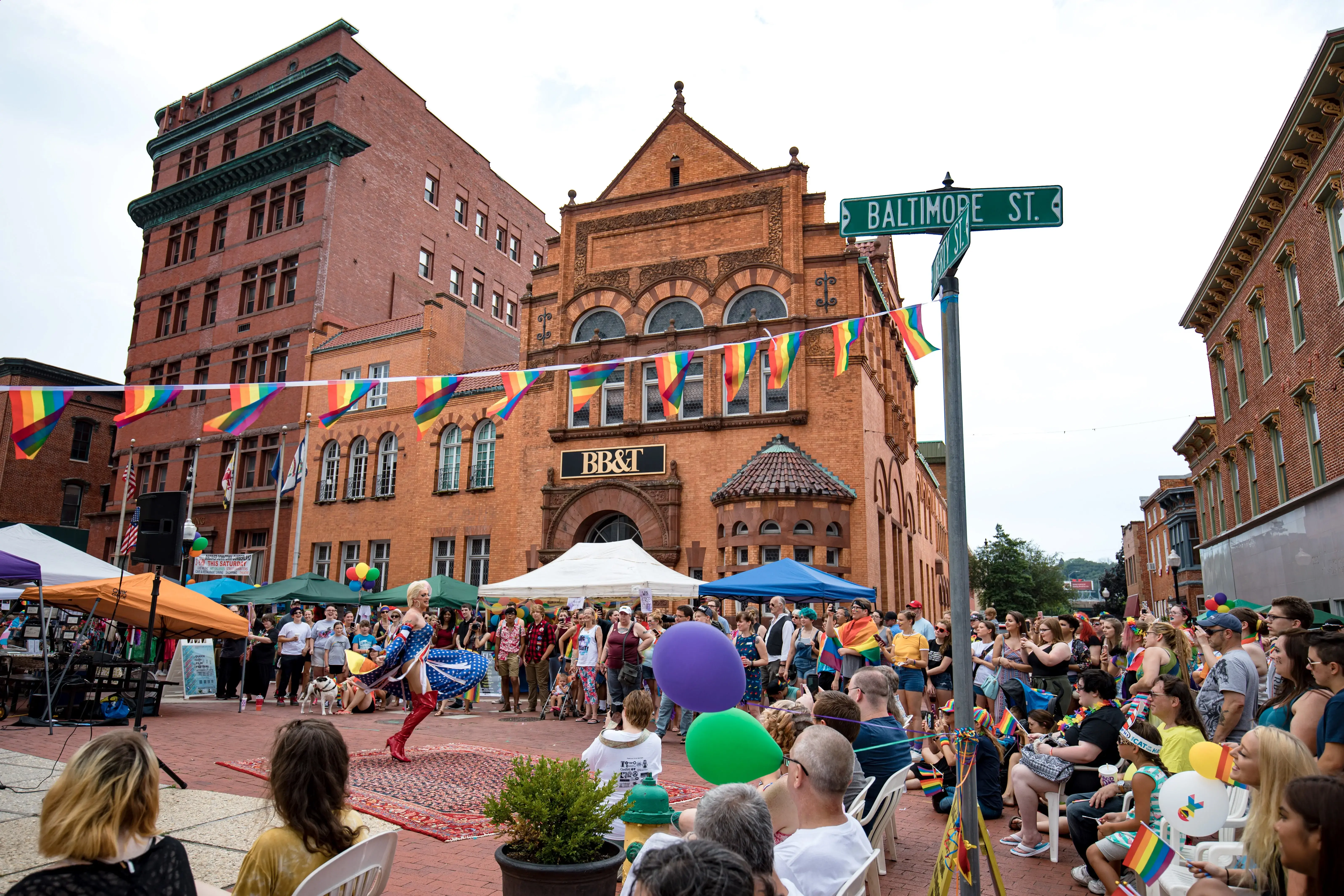Dozens of tents are set up in a wide field with an open-air stage that backs up to the C&O Canal. For several hours under the summer sun, the queens perform to a crowd nearly five thousand strong. Miss Toto, a tall and muscular Chicago-based queen, serves as emcee. She grew up in Cumberland—her grandparents owned Cooper’s bar. “I never thought this would be possible in Cumberland when I was growing up,” she says into the mic. Mona Lott, tears running down her face, says she wishes Rhonda Joe could see this.