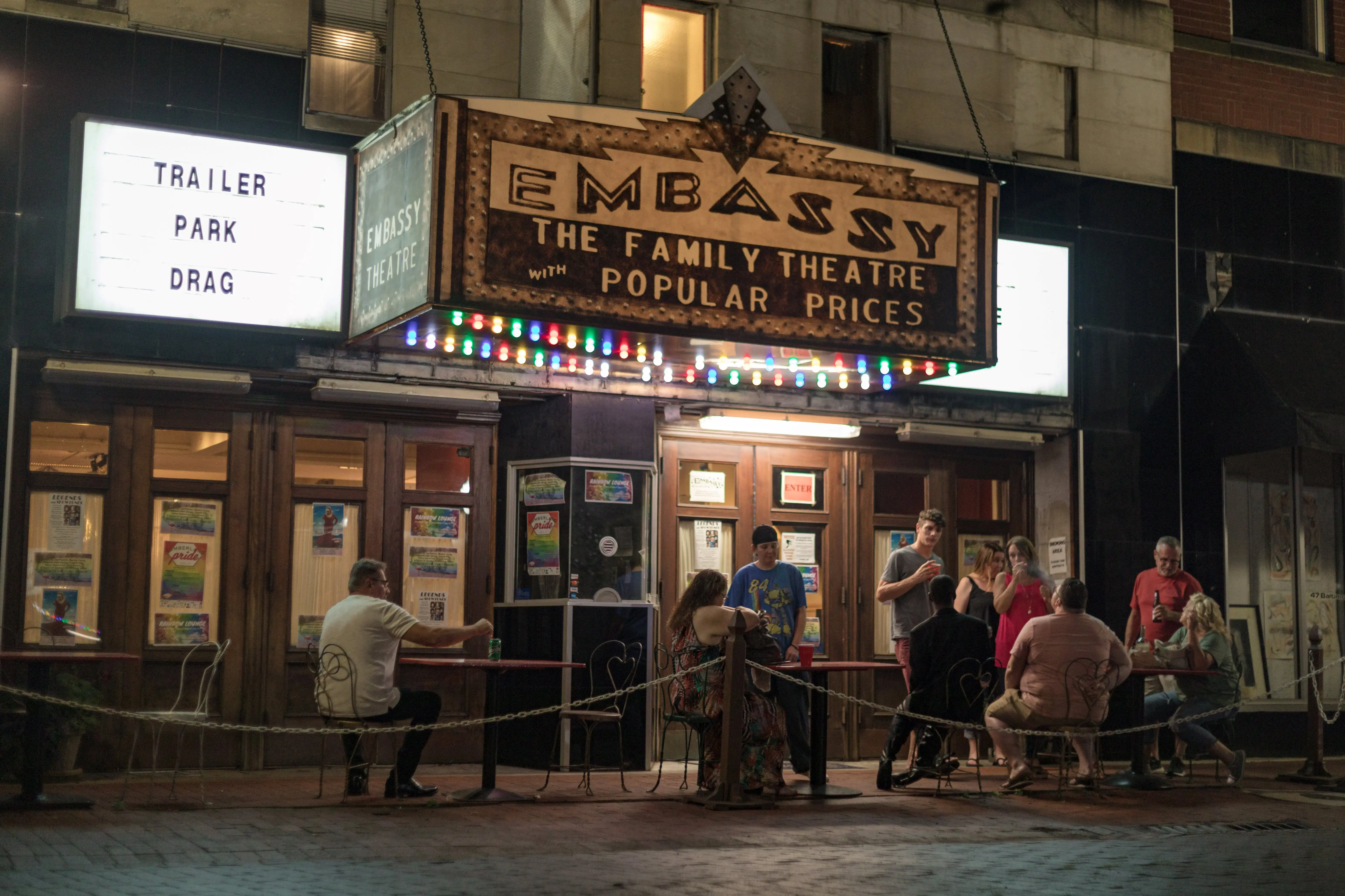 What Rhonda Joe was to Cooper’s, Mark Baker was to the Embassy Theatre. Mark was born in Cumberland in 1946 and left at a young age for New York City to pursue a career in theater. After decades away, he moved back home and reopened the Embassy, which had been closed for years. Mark was a friend and former roommate of Baltimore’s most brazen drag queen, Divine, perhaps best known for her outlandish appearances in multiple John Waters’s films. “Mark absolutely loved drag,” Mona Lott tells me. “He made the Embassy a safe place for gay people to come out, especially once we no longer had gay bars.”
