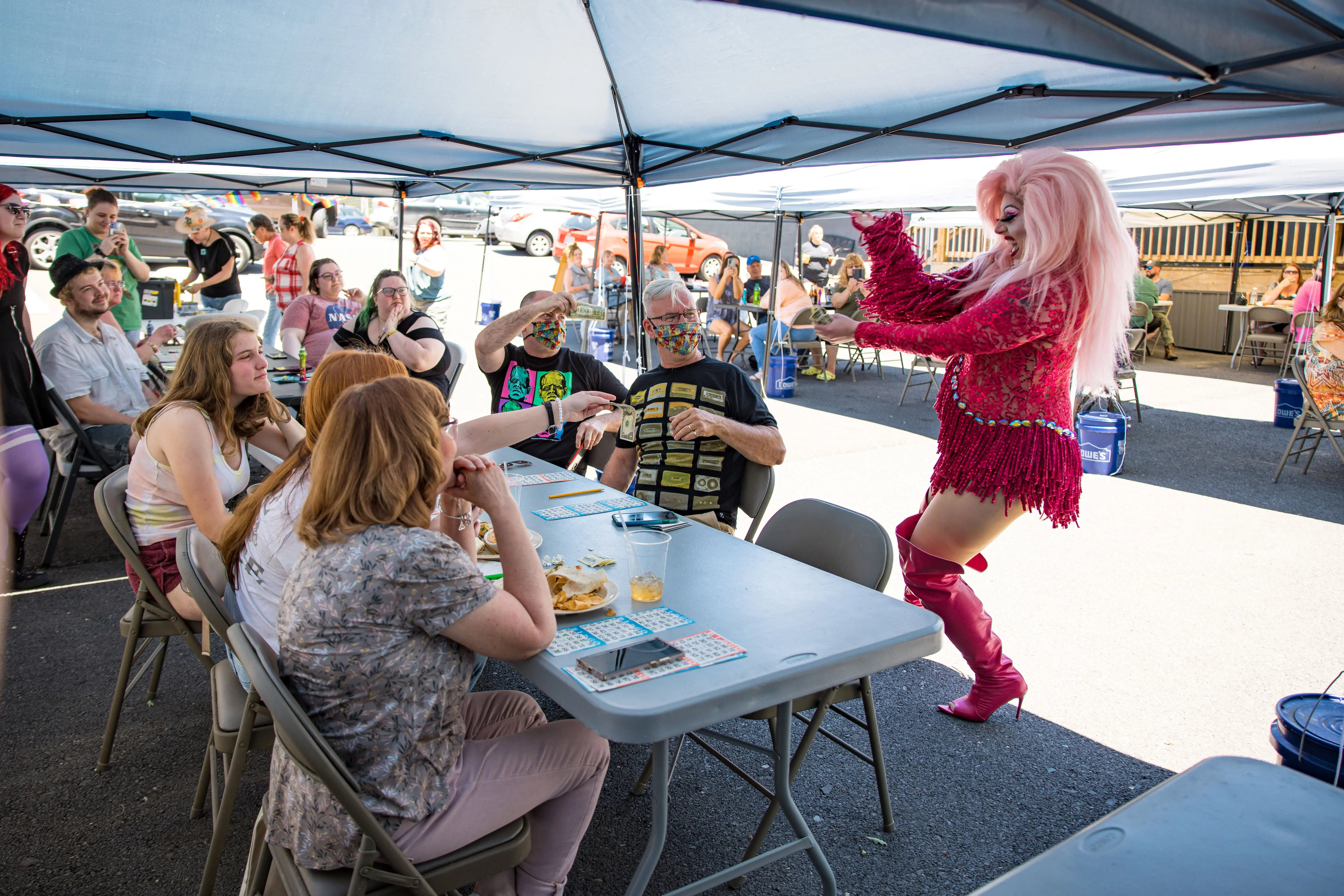 The next afternoon, all the younger queens head over to Lashbaugh’s, a bar just outside of town with a gravel yard and picnic tables clustered around an outdoor stage, for Drag Bingo. By the time I arrive the picnic tables are filling up with customers. Haley Hemorrhoid, wearing a vibrant pink wig and fringe-covered leotard, is on stage as part of sound check. Haley, who has come over from Hagerstown for the weekend, will emcee the drag sets between rounds of bingo, and serve as bingo caller too. The waitresses carry pitchers of beer and platters of fried food. The crowd looks surprisingly country to me and appears to be mostly straight. I scan the tables to see if I can spot anyone who looks uncomfortable in a way that could become aggressive, a sixth sense that’s a queer birthright, at least for those of us raised in conservative places.