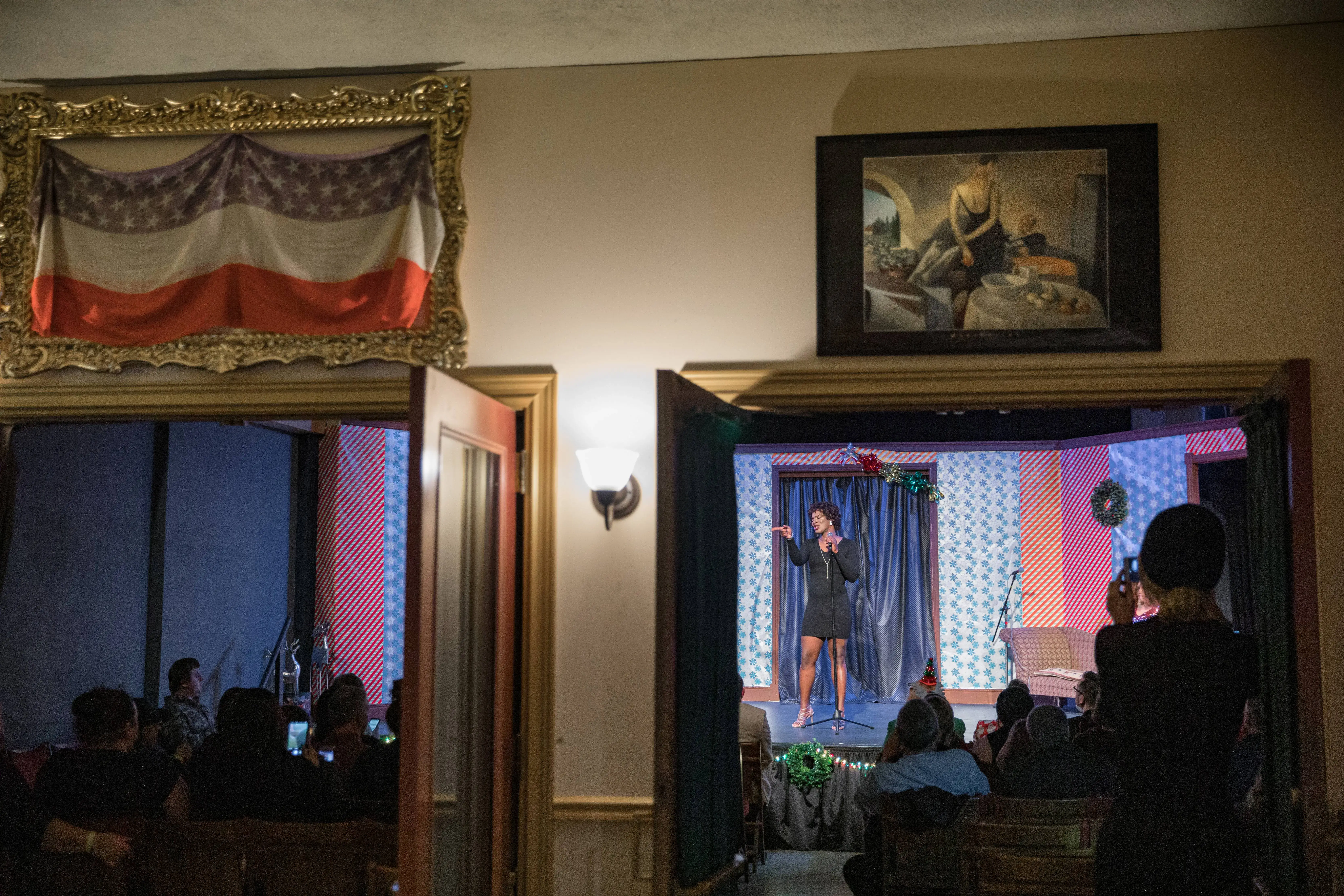 Later that month, French Silk organizes a Drag Family Holiday Story show at a bar in Frostburg, Maryland. In the weeks leading up to the event, the show flier is shared around Facebook by conservatives saying the queens are targeting kids with a “family story” event. I make the drive back up to Frostburg, where the storefronts are strung with lights and wreaths are tacked onto the light poles, and meet Mike at the bar.